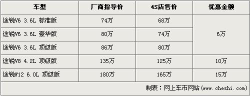 據經銷商銷售人員介紹,目前店內途銳全系均有不同優惠,最高讓利達到了15萬元。搭載V6發動機的3.6L車型優惠現金6萬元,3.6L車型經優惠后售價分別為:標準型68萬元,豪華型74萬元,頂級型80萬元;搭載V8發動機的3.6L頂級型經10萬元優惠后售價降到了125萬元;搭載W12發動機的全系頂配車型6.0L頂級版經15萬元的優惠后售價從180萬降到了165萬元。