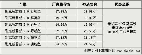 據(jù)4S店銷售人員介紹,目前新君威全系還沒有優(yōu)惠出現(xiàn),各經(jīng)銷商處有一部分現(xiàn)車已經(jīng)到店。而熱銷的紅色款車型仍然是訂單制銷售。目前可選的現(xiàn)車顏色有金色、灰色等款。消費(fèi)者如果訂車的話,需要交2000元訂金,在10-15個工作日內(nèi)便可以交車。