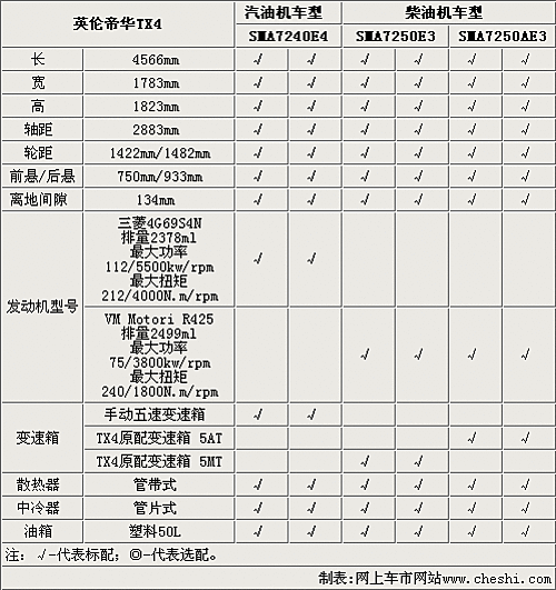 英倫TX4的長寬高分別是4566/1783/1823毫米,雖然是一款A級車的外形尺寸,但這款車的軸距為2883毫米,達到了一款B級車的水平。TX4分為汽油版和柴油版,汽油版搭載三菱4G69系列發動機,而柴油版搭載大眾的R425柴油發動機。從動力數據方面來看,柴油版擁有低速高扭的特點,而汽油版的最大功率達到112千瓦,而且具有很好的經濟性。TX4汽油版匹配手動五速變速箱,而柴油版卻可以匹配原裝的五速自動變速箱。