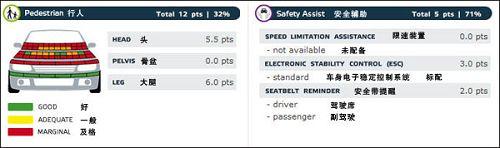 在行人安全測試中,Q5成績差強人意。引擎蓋對行人的骨盆部位防御明顯不足。僅保險杠部分相對傷害較小。在安全輔助設備得分中,Q5標配了ESC車身電子穩定系統,同樣也標配了駕駛席和副駕駛的安全帶提醒。為Q5獲得了71%的得分率。
