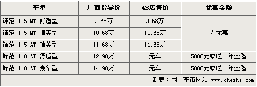 CITY鋒范是本田根據(jù)以中國為代表的全球新興市場的需求而開發(fā)的一款全新車型。鋒范有1.8L 和1.5L兩種發(fā)動(dòng)機(jī)選擇,均采用Honda獨(dú)有的i-VTEC技術(shù)。自上市以來,鋒范的供貨一直比較緊張,而且沒有出現(xiàn)現(xiàn)金優(yōu)惠。近期根據(jù)網(wǎng)上車市價(jià)格監(jiān)測系統(tǒng)顯示,鋒范出現(xiàn)了5000元的現(xiàn)金優(yōu)惠。據(jù)4S店銷售人員介紹,目前鋒范1.8排量車型出現(xiàn)了現(xiàn)金優(yōu)惠,消費(fèi)者購車可以優(yōu)惠5000元現(xiàn)金,或者直接贈(zèng)送一年的全車保險(xiǎn),價(jià)值也在5000元左右。1.5排量仍然沒有出現(xiàn)優(yōu)惠。