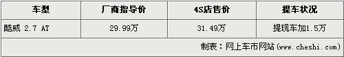 據(jù)4S店銷售人員介紹,在售的道奇酷威為2.7L自動(dòng)檔車型,售價(jià)為29.9萬(wàn)元。近期購(gòu)買(mǎi)酷威的消費(fèi)者如要在經(jīng)銷店提現(xiàn)車,需在廠商指導(dǎo)價(jià)29.99萬(wàn)元的基礎(chǔ)上加價(jià)1.5萬(wàn)元才可提車,加價(jià)后的價(jià)格增長(zhǎng)為31.49萬(wàn)元。銷售人員還介紹,店內(nèi)只有一輛酷威銀色現(xiàn)車。