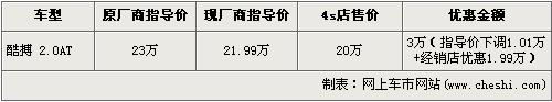 根據(jù)4s店銷售人員介紹,目前官方對(duì)酷搏 2.0 AT版車型的廠商指導(dǎo)價(jià)下調(diào)了1.01萬(wàn)元,下調(diào)后廠商指導(dǎo)價(jià)從23萬(wàn)元降到了21.99萬(wàn)元,并且在店內(nèi)購(gòu)車的消費(fèi)者還可以得到經(jīng)銷店送出的1.99萬(wàn)元的優(yōu)惠。經(jīng)總優(yōu)惠后,道奇酷搏的售價(jià)降到了20萬(wàn)。現(xiàn)車方面,店內(nèi)酷搏現(xiàn)車不多,錯(cuò)過(guò)的消費(fèi)者只能交1萬(wàn)元訂金,下個(gè)月才可提車。