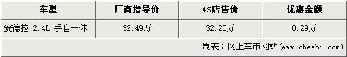 據4s店銷售人員介紹,目前歐寶安德拉現金優惠2900元,在售的2.4L 手自一體車型售價經優惠后降為了32.20萬元。本車外觀共有白、乳白、黑、灰、銀、藍6種顏色,內飾有黑、棕兩種顏色,總共12種顏色搭配供消費者選擇。銷售人員還介紹,店內現車比較有限,以灰色和藍色為主,其他顏色需預訂。