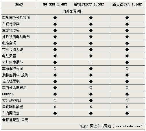 為了令駕乘者得到更多的便利,三車均在內外設計了多項豐富便利的配置,在車輛外部的設計方面三車均有自己的特點,在保證了高性能的前提下,多項豪華配置均出現在三款跨界車型之上,內部的多項設計對乘員的舒適及娛樂需要兩者也都考慮的相當周全,帶MP3的CD播放器以及自動空調等一應俱全。