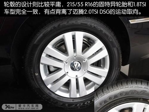 輪轂的設計則比較平庸,完全不符合新邁騰2.0TSI DSG的運動氣質。215/55 R16的固特異輪胎,尺寸也和1.8TSI車型完全一致,也不符合現今車輪越來越大的發展趨勢。較厚的扁平比也明顯是舒適性的取向,與新邁騰2.0TSI DSG技術領先的取向背道而馳。
