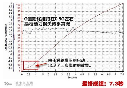 而加速過程中車頭也僅僅是微微上揚,良好的懸掛支撐,使車輛重心的后移并沒有對加速造成太大的麻煩。從曲線圖中我們還可以看出,除了加速初段渦輪扭力的爆發,整個G值曲線均沒有較大起伏,始終維持在0.5G左右,換檔動力損失微乎其微,最后加速成績也定格在7.3秒!比官方公布的8.3秒快了整整1秒!