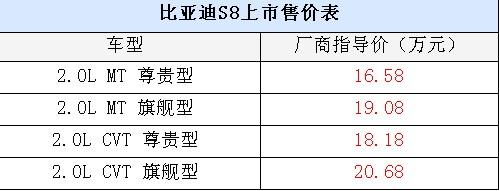 2009年7月19日,比亞迪旗下首款雙門硬頂跑車S8正式上市。新車共推出2.0L排量的四款車型,售價16.58-20.68萬元。此次為S8在深圳的首站上市,隨后S8還將陸續在國內多個城市上市。新車詳細售價請見下表: