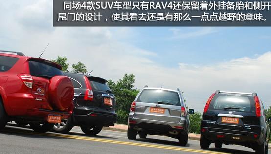 RAV4是國產豐田陣型中體積最小的SUV車型,但也運用了其余兩個老大哥的一些設計元素。引擎罩上兩條隆起的肌線露出些許SUV的氣勢,修長的車身線條使整車看起來毫不失色于其他對手。RAV4是同場4款SUV車型唯一還保留著外掛備胎的設計,使RAV4從后方看去還是有那么一點點越野的性格。