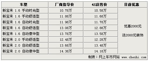 據4S店銷售人員介紹:目前大眾新寶來全系無現車,預訂需等3周至4周時間,訂金只需交1000元即可。車價方面,新寶來全系優惠2000元,如在店內辦理一條龍服務還可送2000元裝飾;2000元裝飾是消費者可以隨意在店內選擇,包含地膠、腳墊等,為您提供方便。