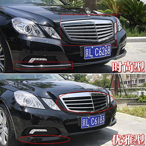 奔馳新E300優(yōu)雅型和時尚型的前臉差異,主要體現(xiàn)進氣格柵和前保險杠設計上。奔馳新E300優(yōu)雅型前進氣格柵為4鍍鉻橫條設計,并且在前保險杠LED日間行車燈下配備了鍍鉻飾條。而奔馳新E300時尚型的進氣格柵為3鍍鉻橫條設計,并且前保險杠采用運動型設計。