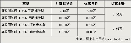 據經銷商處銷售人員介紹,賽拉圖歐風全系最高出現了最高1.63萬元的優惠。賽拉圖歐風在售的有4個車型,入門級的1.6L手動標準版的優惠金額為1.38萬元,售價從廠商指導價9.18萬元降到7.80萬元,1.6L豪華版的手動版和自動版車型都經全系最高1.63萬元優惠后,售價分別降至8.95萬元和10.05萬元。