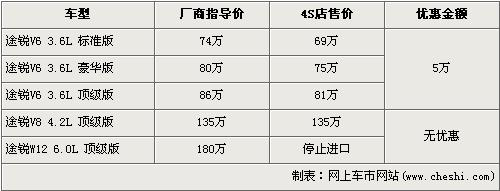 據經銷商銷售人員介紹,途銳的旗艦車型W12缸的6.0L頂配型已經停止進口。而3.6L的車型有5萬元的優惠,最低配的3.6L標準型的售價從74萬元下跌到了69萬元,首次跌破了70萬元。4.2L頂級版由于店內沒有現車所以沒有優惠,欲購買的消費者需交訂金10萬元,約等2個月才可提車。