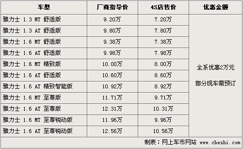 據廣汽豐田北京地區4S店銷售人員介紹,現在購買雅力士車型全系優惠現金2萬元。目前雅力士1.3車型和1.6舒適、精致均有現車供應,至尊及銳動版現車數量較少,部分車型需預訂。現車顏色以黑色、紫色、銀色為主。如消費者有意購買,到店詳談會有更優惠的價格。北京地區各4S店由于訂單不同,各店銷售的現車顏色有所不同。