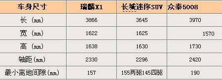 瑞麒X1定位于奇瑞首款微型SUV產品,長寬高分別達到3866×1622×1638mm,軸距也達到了2330mm。體積在三車中低于眾泰5008,但高于長城迷你SUV。