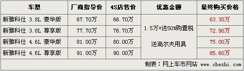據進口現代4S店銷售人員介紹,目前新雅科仕車型優惠1.5萬元,并返還50%購置稅。返還的購置稅分別從2.9萬-3.9萬不等,其中4.6L尊享版購置稅最高返還近4萬元,最終購買價格約85.6萬元。新雅科仕最低實際購買價格63.3萬元。另據介紹,現購買新雅科仕還贈送高爾夫用具。如消費者有意購買,到店詳談會有更優惠的價格。北京地區各4S店由于訂單不同,各店銷售的現車顏色有所不同。