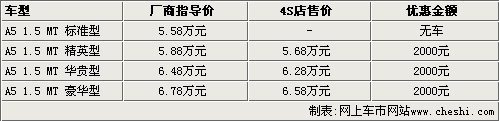 據(jù)奇瑞汽車4S店銷售人員介紹,目前奇瑞A5標(biāo)準(zhǔn)型由于配置太低,4S店內(nèi)無(wú)車銷售,其他三款車型現(xiàn)車都比較齊全。現(xiàn)在A5的優(yōu)惠幅度比元旦前要少,只能優(yōu)惠2000元,而且不能贈(zèng)送裝飾。