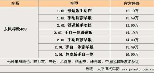 1月25日,東風(fēng)標(biāo)致408在北京全球首發(fā)上市,這是標(biāo)致汽車品牌創(chuàng)立120年以來(lái),首次在海外市場(chǎng)全球首發(fā)其最新一代車型,同時(shí)公布了全系車型的售價(jià)。此次上市的東風(fēng)標(biāo)致408系列共有7款車型,分為舒適版、豪華版、尊貴版三種配置版本,以配備CVTS-II技術(shù)的2.0L發(fā)動(dòng)機(jī)為主打產(chǎn)品,其價(jià)格從12.99萬(wàn)元至16.99萬(wàn)元;同時(shí)408系列中也包含1.6L發(fā)動(dòng)機(jī)系列,其手動(dòng)舒適版入門(mén)售價(jià)為12.19萬(wàn)元,主打車型2.0L舒適版手自一體版售價(jià)為14.19萬(wàn)元。7款車型的售價(jià)如下表: