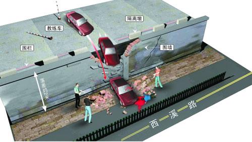 走進駕校場地,可以看到,學車的場地邊有高約20厘米的圍欄和更高更敦實的隔離墩。從現場看,肇事的教練車先是撞破了圍欄和隔離墩,然后才撞破了圍墻,飛到了落差達2米之下的人行道上。