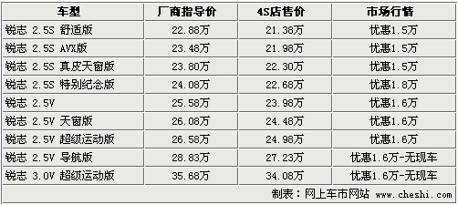 豐田銳志作為一款以運動著稱的后驅中級車,在性能以及操控各方面表現都令人滿意,尤其是獨具個性的改裝潛力,讓很多癡迷運動的車迷們找到了充分的駕 駛樂趣。銳志配備有2.5L和3.0L兩種排量的發動機,同時超長的軸距設計讓乘員的空間也有了非常理想的狀態。近日根據網上車市價格監測系統顯示,目前 購買銳志車型,最高可享受到1.8萬元的現金優惠。具體車型見下表:
