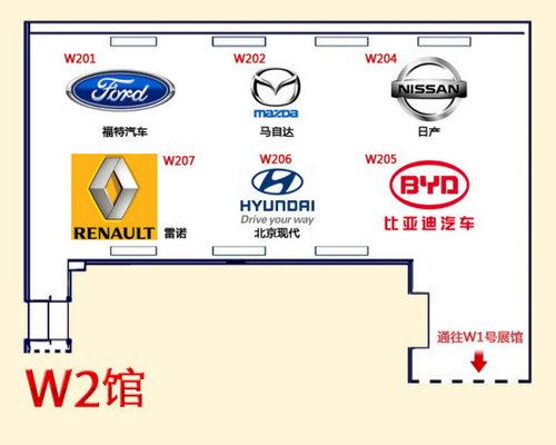 在本屆北京車展,W2館有日產、現代、馬自達、比亞迪汽車、福特汽車、雷諾等共6個品牌參展,主要亮點車型:日產LEAF、日產Juke、北京現代RC、北京現代i50、馬自達馬自達8、比亞迪S6/L3、福特銳界、福特新福克斯以及雷諾新梅甘娜CC等。