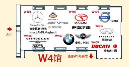 W4館將有沃爾沃、寶馬、MINI、克萊斯勒、英菲尼迪、東南、杜卡迪中國、梅賽德斯-奔馳、smart、AMG、邁巴赫等11個品牌參展,主要亮點車型包括沃爾沃新S60、華晨寶馬5系加長版、寶馬VED概念車、MINI Countryman、克萊斯勒新大切諾基、英菲尼迪QX56、奔馳全新E級敞篷以及奔馳2011款R級等。