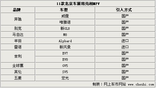 這次在2010北京車展上展出的MPV共有十余款,我們選擇了奔馳、別克、馬自達、雷諾、豐田、吉利、全球鷹、英倫、五菱共9個品牌11款車型。在國內知名度相對較高的車型有別克GL8,馬自達8以及五菱宏光。下面將為您奉上這十余款車型的詳細介紹,希望您能夠喜歡。