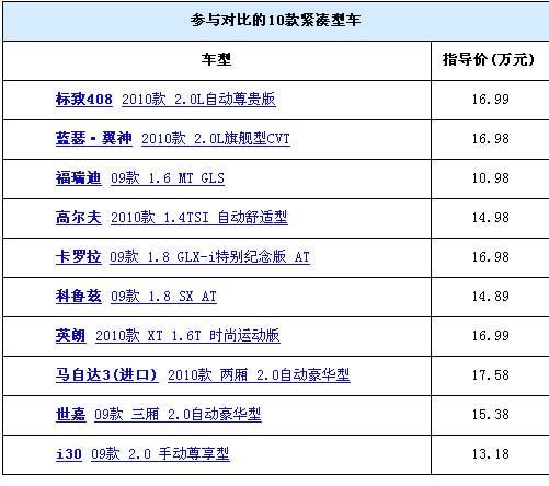 汽車之家的年度大戲又開鑼了!經過兩個多月的精心策劃和準備,我們組織了這次大型的緊湊型車全面對比!我們的目標是將市場上主流的緊湊型車一網打盡,來一次從里到外、從靜到動的全面PK。這次一共邀請到了以下十款車型,他們款型相對都比較新,消費者在選車的時候經常徘徊其中。從今天開始,我們將分別從外觀與做工、內飾與空調、儲物空間、乘坐空間等四個靜態方面和動力與操控性能、燃油經濟性等兩個動態方面以及保養售價等對這十款車進行全面的對比。