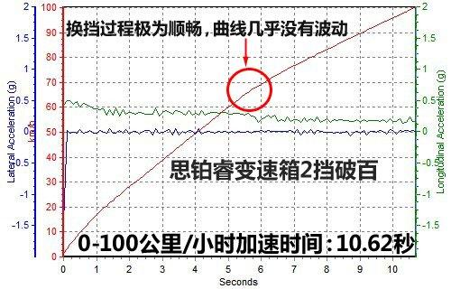 既然說到這里,就讓我們先來看看思鉑睿的加速成績。如果你用S擋自動模式(關掉車身穩定控制),起步的時候根本聽不到輪胎有一絲接近極限的跡象,看著發動機轉速慢慢攀升的樣子讓人覺得時間十分漫長,最終的成績都將會在11秒開外,這顯然不能代表思鉑睿的真實水平。后來測試中我們在S擋下改用手動模式,盡管思鉑睿的5擋變速箱可以2擋破百,也就是說在測試過程中只需要換一次擋,但區別還是很大。在S擋模式下,發動機轉速會在不到6500轉/分鐘的時候自動換擋,而手動模式可以把轉速拉到7000轉,這樣一來在換到2擋時就可以獲得更高的轉速,加速成績可以提高將近一秒鐘左右。最終我們實測的思鉑睿0-100加速成績為:10.62秒。