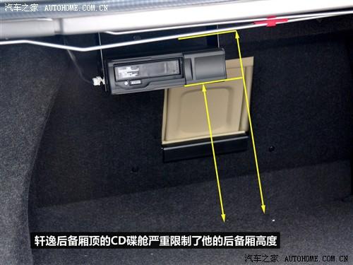 馬自達6寬大的車尾造就了它不錯的后備廂空間,而德系車型的后備廂規整程度一直有口皆碑,而軒逸的后備廂相比他們的確不夠大,除了寬度和深度之外,高度上的劣勢更加明顯,這主要是因為后備廂頂部固定的碟盒占用了太多的高度。
