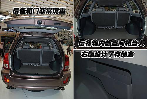 威麟X5的后備箱門非常沉重,雖然采用液壓挺桿支撐,淡開啟還需費些力氣。行李箱內的空間非常大,就算再多一排座椅也完全可以接受。行李箱右側設計了存儲盒,可以放置一些工具等物品。