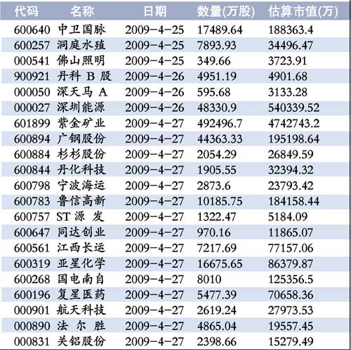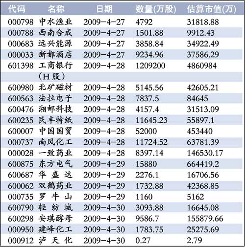 值得一提的是,本周解禁的204億股包括了A股和H股兩部分。H部分是28日將解禁的工商銀行(601398)120.92億限售股,這部分股份占了本周統計解禁總量的59%,解禁對A股影響不大。工行日前公告稱,本周,高盛共持有164.76億股工行H股,有一半將于4月28日解禁,其余將于10月20日解禁。而高盛3月25日宣布,自愿將所持有的80%(約131.8億股)工行限售股限售期延長1年,至2010年4月28日;余下的20%將于4月28日解禁。如高盛擬出售其將于2009年4月28日解禁的H股股權,高盛將會研究能提高價值及降低市場影響的可行方案,并優先考慮以私募配售方式出售給投資者。