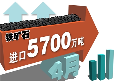 海關12日公布的數據顯示,4月份,我國鐵礦石進口5700萬噸,創造了歷史新高。我國鐵礦石進口自1月以來連續4個月攀升,1-4月份合計進口鐵礦石18846萬噸,累計增長22.9%。