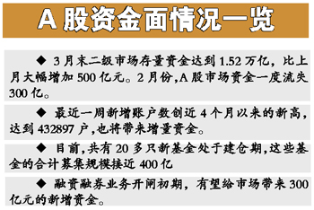 由上海證券報和申銀萬國研究所聯合推出的股市月度資金報告顯示,今年3月末,A股市場的存量資金在經歷了近3個月的盤底振蕩后開始上升,當月末二級市場存量資金達到1.52萬億,比上月大幅增加500億元。這個跡象,使得二月份一度明顯流失的市場資金面再度回穩,此前的2月份,A股市場資金一度流失300億。