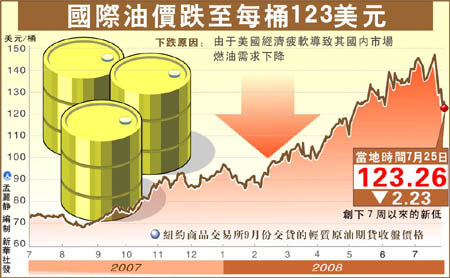 勇闖150美元/桶關(guān)口未果,國際原油價格連日來大幅下挫。上周最后一個交易日(7月25日),紐約商品交易所原油期貨價格跌至每桶123美元水平,創(chuàng)下7周以來新低。與本月11日創(chuàng)下的每桶147.27美元的盤中歷史最高紀(jì)錄相比,紐約商品交易所原油期貨價格在半個月內(nèi)已累計下跌超過24美元。