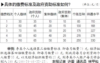 最低的個人繳費標準確定為30元,以20元為級差,向上設立五個檔次的繳費標準,最高一檔為110元。參保農民可根據各自的經濟承受能力自愿選擇一檔繳費,多繳多得!掇k法》對經濟組織設計了5個檔次的繳費標準,從10元至50元不等;對于確無經濟能力的經濟組織,也可以暫不為參保人繳費。