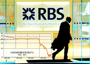 周一倫敦市場,RBS股價狂瀉67%,創20多年來最大單日跌幅,股價最低跌至僅為10便士,為至少25年來最低點。