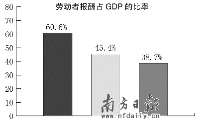 2000年—2006年間,勞動者報酬占GDP的比率從45.4%降到38.7%,6年降低了6.7個百分點。如果與改革開放初1978年的60.6%相比,下降幅度則達21.9個百分點。而且,廣東居民收入增速慢于東部沿海5省份,也慢于泛珠九省。