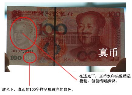 一看。即看鈔票上的固定人像水印、白水印、光變油墨面額數(shù)字、交印對(duì)應(yīng)圖案、隱形面額數(shù)字等特征。據(jù)介紹,真鈔票的“固定人像水印”有立體感,清晰度高,“白水印”的高透光反光性強(qiáng),“交印對(duì)應(yīng)圖案”是一個(gè)圓形方孔錢(qián)。這三處在迎光透視時(shí)都可以清楚看見(jiàn);光源角度發(fā)生改變時(shí),真幣的“光變油墨面額數(shù)字”會(huì)有綠色和藍(lán)色顏色的漸變;此外,在與眼睛平行上下抖動(dòng)時(shí),可以看到“100”的隱形面額數(shù)字。