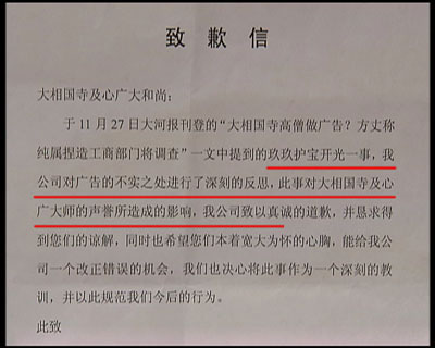 就在記者對玖玖理療褲的虛假廣告進行調(diào)查時,河南開封大相國寺向記者出具了一份玖玖理療褲河南開封經(jīng)銷商,寫給大相國寺的一封致歉信,承認自己假冒僧人的錯誤行為,從此廣告中來自大相國寺的高僧空智,就如同人間蒸發(fā),再也沒有出現(xiàn)過,取而代之的是佛教禪宗第36代傳人,但卻有著相同的名字和面孔——空智。