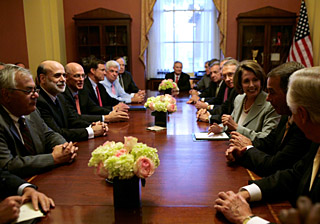 在公布金融救援計(jì)劃前,美國財(cái)政部長保爾森、美國聯(lián)邦儲(chǔ)備委員會(huì)主席伯南克和布什進(jìn)行了緊急磋商;保爾森等官員隨后又拜會(huì)多位資深議員,爭取到了他們的支持。