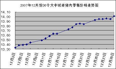 中新網(wǎng)1月2日電 國(guó)家發(fā)改委網(wǎng)站發(fā)布消息稱(chēng),據(jù)國(guó)家發(fā)展改革委價(jià)格監(jiān)測(cè)中心監(jiān)測(cè),元旦前一周(2007.12.24-2007.12.29,下同)全國(guó)36個(gè)大中城市豬肉(精瘦肉)集市平均零售價(jià)格每500克為13.96元,比上期(2007.12.17-2007.12.21,下同)上漲1.09%。