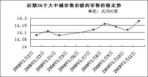 中新網1月14日電 國家發改委網站消息稱,據國家發展改革委價格監測中心監測,上周(2008.1.7-2008.1.11,下同)全國36個大中城市集市豬肉(精瘦肉)平均零售價格每500克為14.14元,比前一周(2007.12.31-2008.1.4,下同)上漲0.35%。
