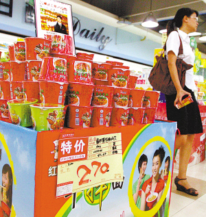 某超市一桶裝方便面品牌打出降價招牌(資料圖片)記者 畢克勤 攝