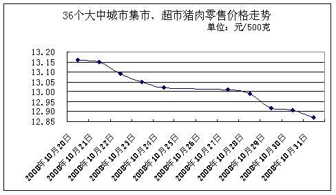 中新網11月3日電 據國家發改委網站消息,國家發改委價格監測中心監測顯示,上周(2008.10.27-2008.10.31,下同)全國36個大中城市集市、超市豬肉(精瘦肉)平均零售價格每500克為12.94元,與前一周(2008.10.20-2008.10.24,下同)相比下降1.18%。