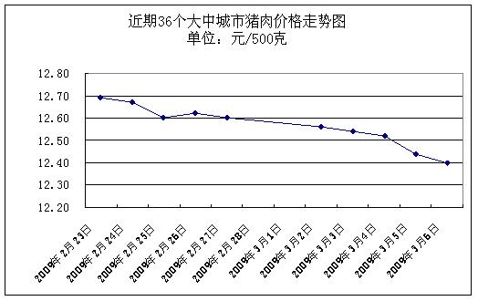 中新網3月9日電 據國家發改委網站消息,據國家發展改革委價格監測中心監測,上周(2009.3.2-2009.3.6,下同)全國36個大中城市集市、超市豬肉(精瘦肉)平均零售價格每500克為12.49元,與前一周(2009.2.23-2009.2.27,下同)相比下降1.19%。