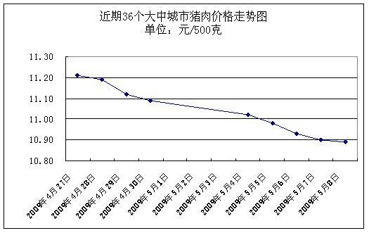 中新網(wǎng)5月11日電 據(jù)國(guó)家發(fā)展改革委價(jià)格監(jiān)測(cè)中心監(jiān)測(cè),上周(2009.5.4-2009.5.8,下同)36個(gè)大中城市集市、超市豬肉(精瘦肉)平均零售價(jià)格每500克為10.94元,與前一周(2009.4.27-2009.4.30,下同)相比下降1.88%。