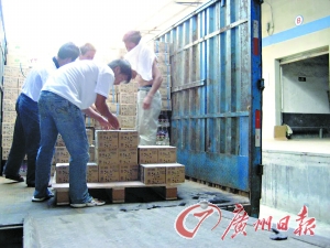 搬運工人正在將查處的假冒產品搬運上車。