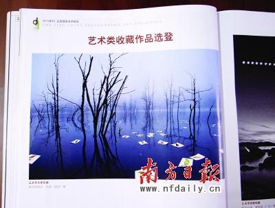 電話里,陳聯軍告訴記者,他愛好攝影,這次也投了稿。但7月底,陳聯軍把藝術類金獎作品《明天的現實》圖樣拿給廣告公司的同事看,結果同事們發現,《明天的現實》的背景———被水淹沒的枯樹林與10年前他們所購買的《全球最新圖庫大百科》圖庫里一張未署名的相片如出一轍,只是調換了方位“翻了個身”。