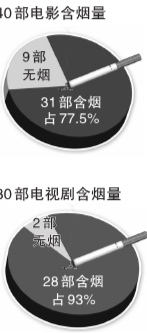 從2007年開始,中國控煙協會每年都會對熱播的國產影視劇中的吸煙鏡頭進行監測統計。對2009年熱播的40部電影和30部電視劇進行的監測結果顯示:在40部電影中有9部電影完全沒有煙草鏡頭,31部影片有煙草鏡頭,占影片的77.5%;30部電視劇中,2部沒有煙草鏡頭,28部有煙草鏡頭,占電視劇比例的93%。